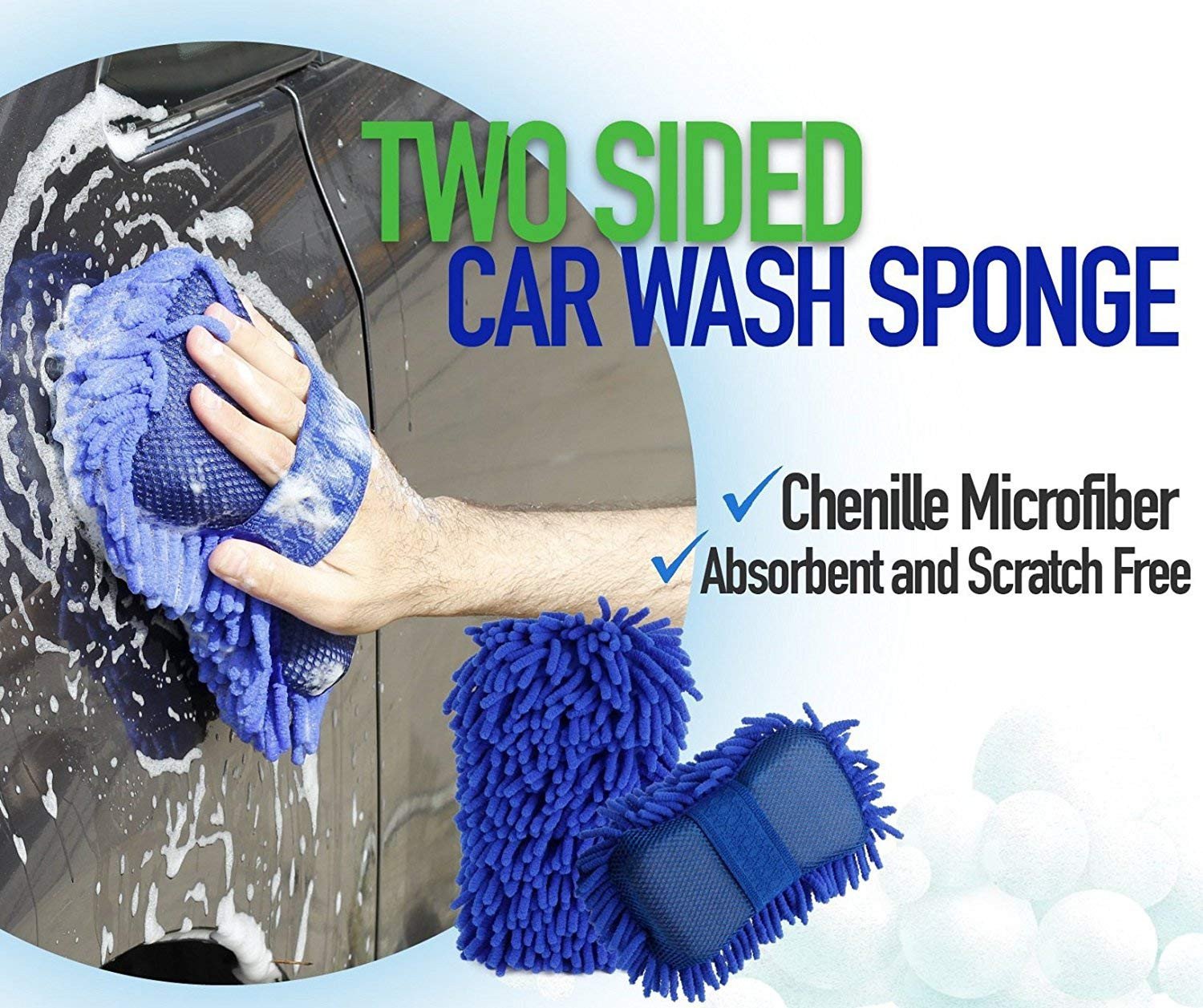 Package content - Total 3 pc: Premium double-sided microfiber chenille car wash mitt gloves (1), Microfiber Cloth (1), and Microfiber Car Wash Sponge (1)