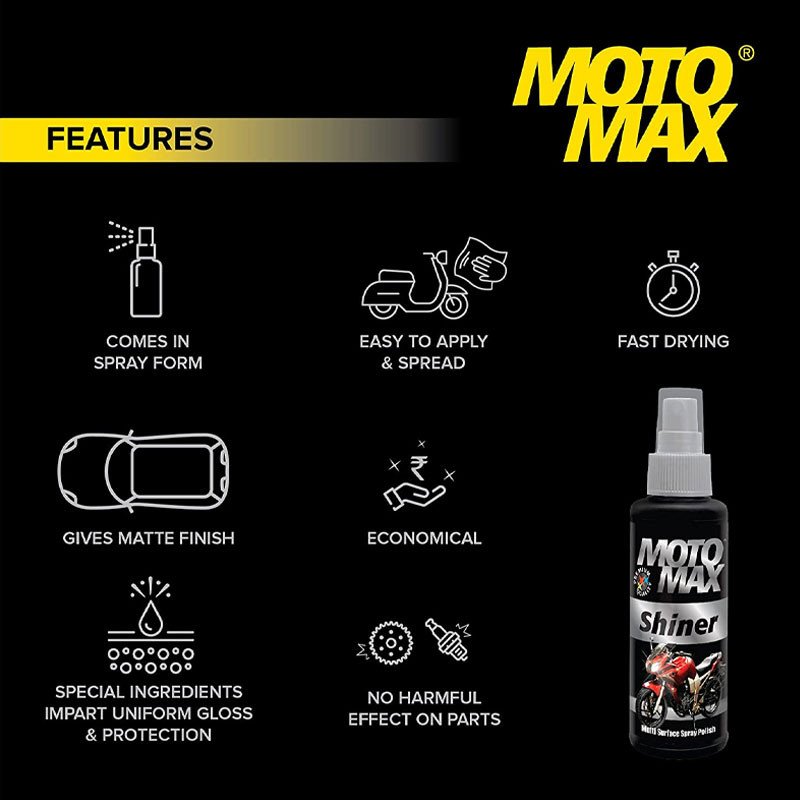 This Shiner Multi Surface Spray Polish glaze eliminates fine swirl marks to produce deep, wet reflections with high gloss. This bike and car polish also adds depth of color, especially on dark-colored cars and leaves the paint finish incredibly clear and glossy with mirror-like reflections. The spray can be used on plastic, metallic and painted surfaces and you can also use it on scooters. It is suitable for use with rubber and tyre parts as well since it is a multi-surface car polish and wax solution.
