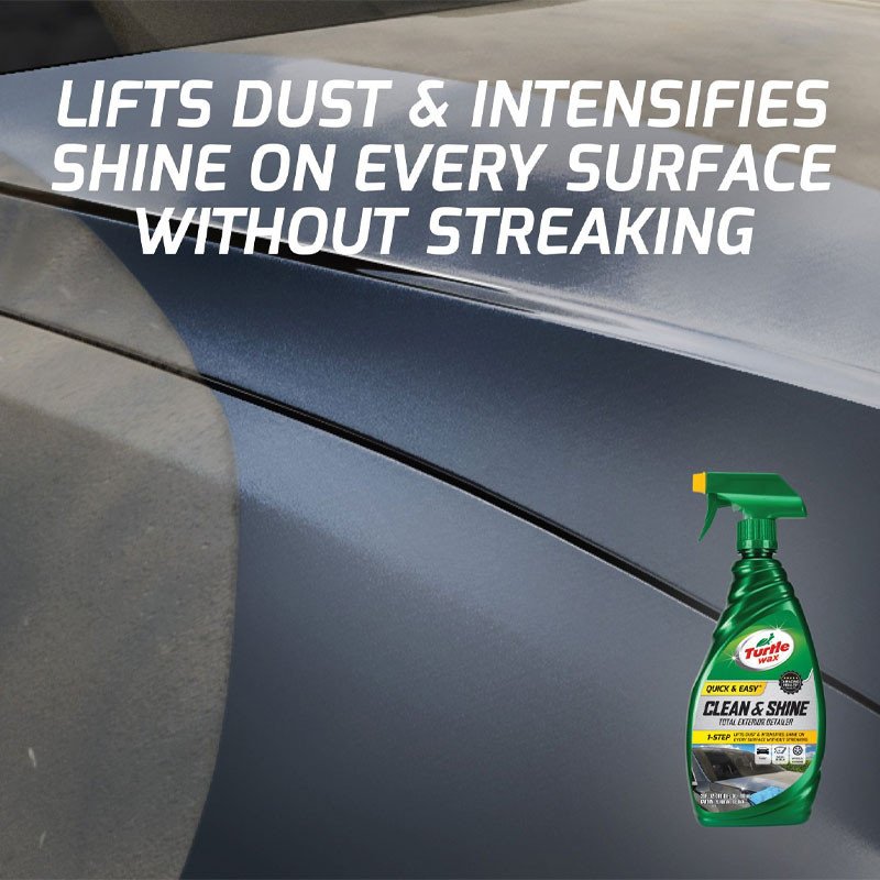 Turtle wax introduces a new and innovative detailer spray with a totally new technology that cleans with soil encapsulating polymers. Turtle wax quick & easy clean & shine detailer is a product so universal, it even cleans glass inside and out! This product is designed to safely clean all exterior surfaces while preserving the shine and leaving surfaces streak-free, with less time and effort! Now wipe a car clean in minutes, including glass! The new formula repels dusty soil to keep finishes cleaner longer. Turtle wax quick & easy clean & shine detailer is perfect for all automotive paints, exterior plastic, rubber trim, and glass. The easy to spray and wipe formulation contains encapsulating polymers to surround soils and pull them away from exterior surfaces into any microfiber cloth. This polymer attraction quality helps prevent light swirl marks on today's clear coat paint for an improved appearance even on dark and scratch-sensitive finishes. Turtle wax quick & easy clean & shine detailer also preserves water beading with carnauba wax and contains UV protection to help prevent fading from harsh sun exposure. It can be applied in direct sunlight. Key ingredients in this formula provide anti-static and dirt-repellent properties to help keep a car's finish cleaner longer. Use several microfiber towels on heavier soils, bird droppings, and bugs. This product is perfect for use anytime and as often as needed for removing fingerprints, smudges, light soils, accumulated dust, and keeping glass sparkling clean usage directions:- lightly mist turtle wax quick & easy clean & shine detailer onto the exterior and interior glass first. Remove with a clean dry microfiber cloth. Spray product lightly onto one body panel at a time. Wipe with a microfiber towel. Repeat process for an entire vehicle making sure to cover all paint, wheels, and trim. Turtle wax clean & shine can be applied to hot or cool surfaces. Use anytime light cleaning is needed. Turtle wax clean turtle wax quick & easy clean & shine total exterior detailer